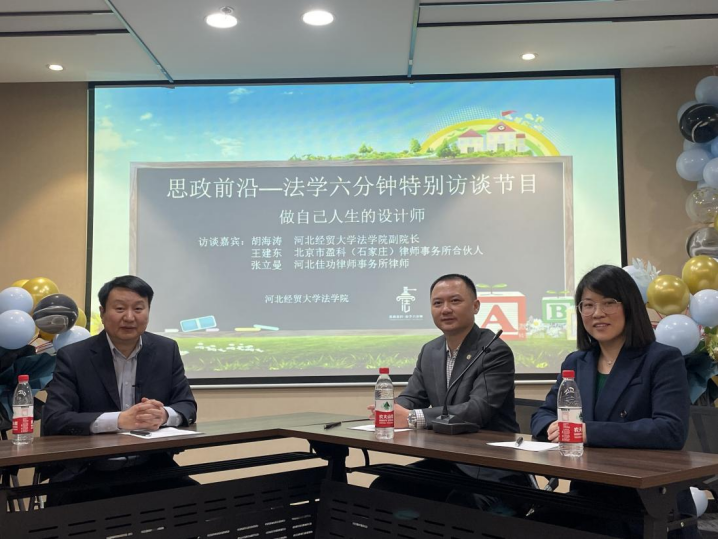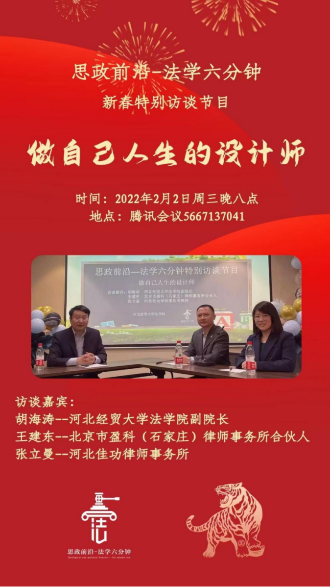 本期为同学们带来的是法学六分钟的特别节目——做自己人生的设计师。作为首次特别栏目,我们有幸邀请到了北京盈科(石家庄)律师事务所的合伙人王建东律师,以及河北佳功律师事务所的张立曼律师,并由太阳成集团tyc122ccvip副经理胡海涛老师作为本次活动的主持人,与嘉宾进行访谈交流。