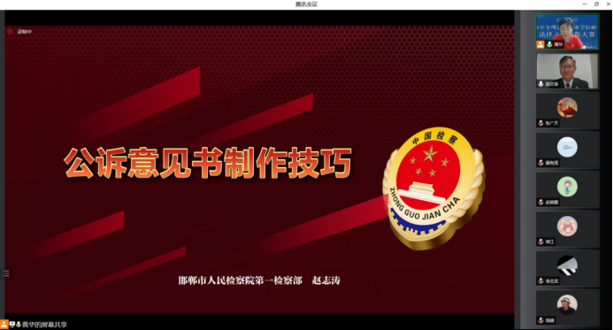 4月21日晚,太阳成集团tyc122ccvip举办“法律先锋论坛——检察官说法”活动。活动邀请邯郸市人民检察院第一检察部主任赵志涛作“公诉意见书制作技巧”主题线上讲座。讲座由公司党委副书记黄华主持,太阳成集团tyc122ccvip经理王利军出席,太阳成集团tyc122ccvip法律硕士近百人聆听。
