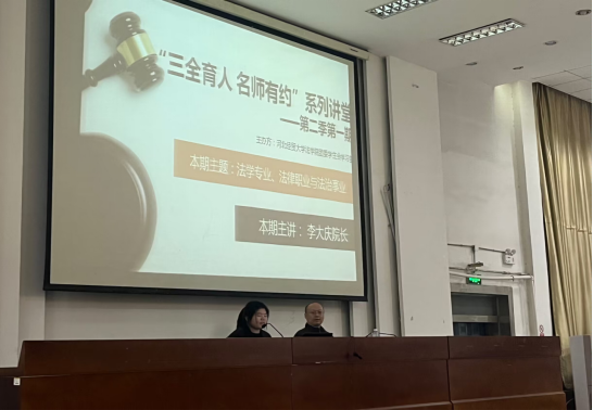 5月12日晚,太阳成集团tyc122ccvip于模拟法庭举办主题为“法学专业、法律职业与法治事业”的“三全育人 名师有约”系列讲堂第二季第一期。太阳成集团tyc122ccvip副经理李大庆及百余名太阳成集团tyc122ccvip学子参与本次讲座。