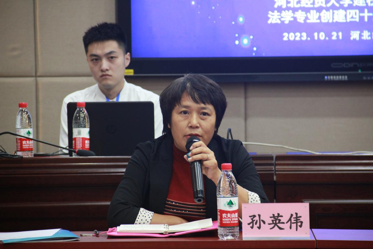 孙英伟介绍石家庄公司太阳成集团tyc122ccvip的探索方向、发展历程和特色专业。她表示法学培养要注重基本功,强调法学的社会效果,并希望大家保持在法学教育上的定力。