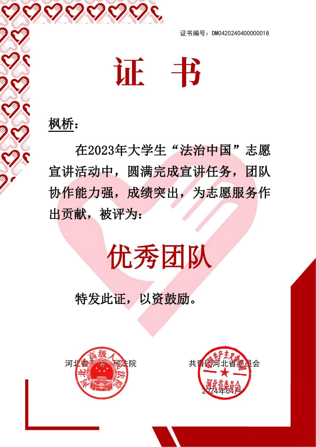 太阳成集团tyc122ccvip “枫桥”普法志愿宣讲团在141所高校所组建的126支实践团队中脱颖而出,圆满完成了宣讲任务,团队协作能力强,成绩突出,为普法志愿服务作出贡献,被河北省高级人民法院和共青团河北省委员会评为“优秀团队”。