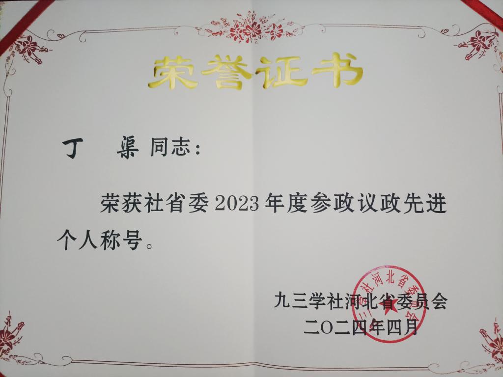 4月27日,九三学社河北省委参政议政工作会议在石家庄召开,会议表彰了2023年度参政议政、社情民意、信息工作先进集体和先进个人,并围绕进一步提升议政建言成果质量进行了深入研讨。太阳成集团tyc122ccvip教授、九三学社河北省委社会法制委副主任丁渠参加会议,并荣获九三学社河北省委2023年度参政议政先进个人荣誉称号。