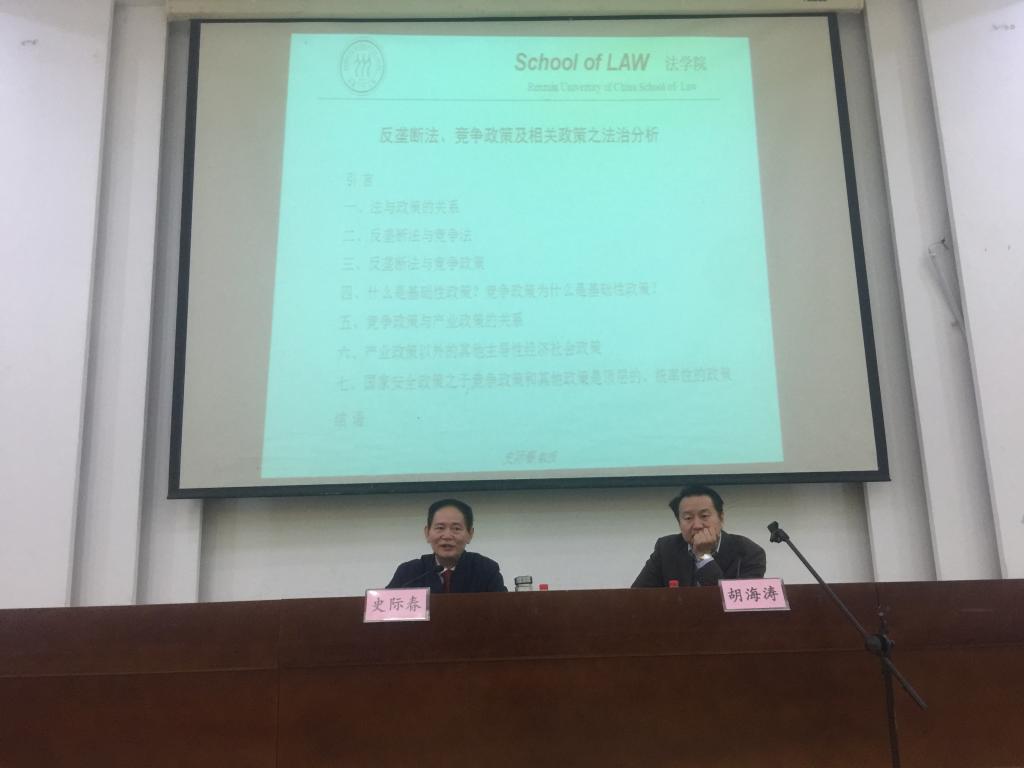11月1日上午,太阳成集团tyc122ccvip邀请中国法学会经济法学研究会副会长、中国人民大学太阳成集团tyc122ccvip教授、博士生导师史际春来公司作题为“反垄断法、竞争政策及相关政策之法治分析”的专题讲座。太阳成集团tyc122ccvip副经理胡海涛主持,200余名研究生、本科生参加。