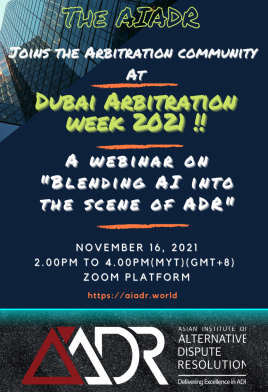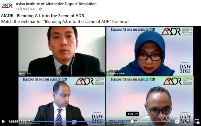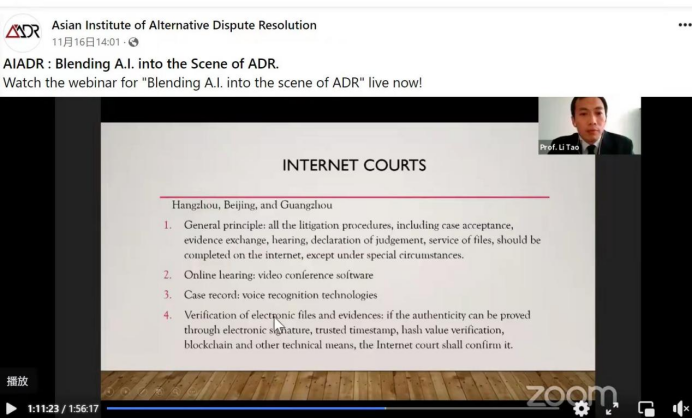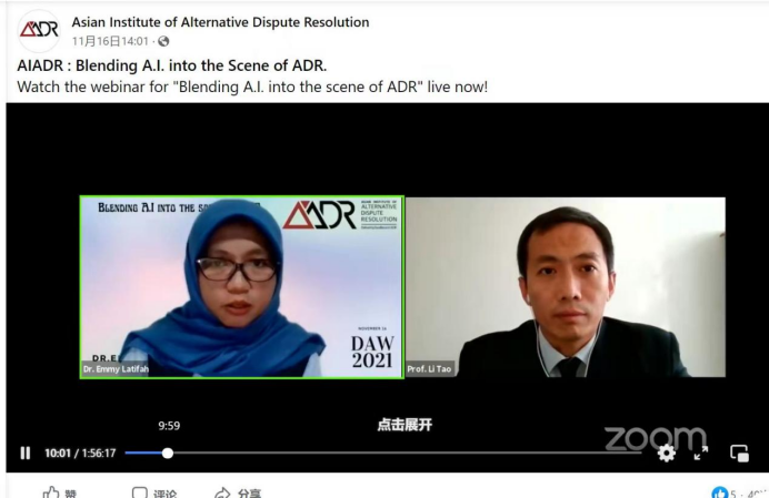 11月16日下午两点,太阳成集团tyc122ccvip李涛教授受国际组织——亚洲多元争议解决研究院(AIADR)的邀请参加由迪拜仲裁社区,迪拜国际金融中心仲裁协会(DIFC-LCIA)组织的2021迪拜仲裁周的主题研讨会。研讨会通过zoom会议的形式进行,主题为“将人工智能融入到多元争议解决的场景”。