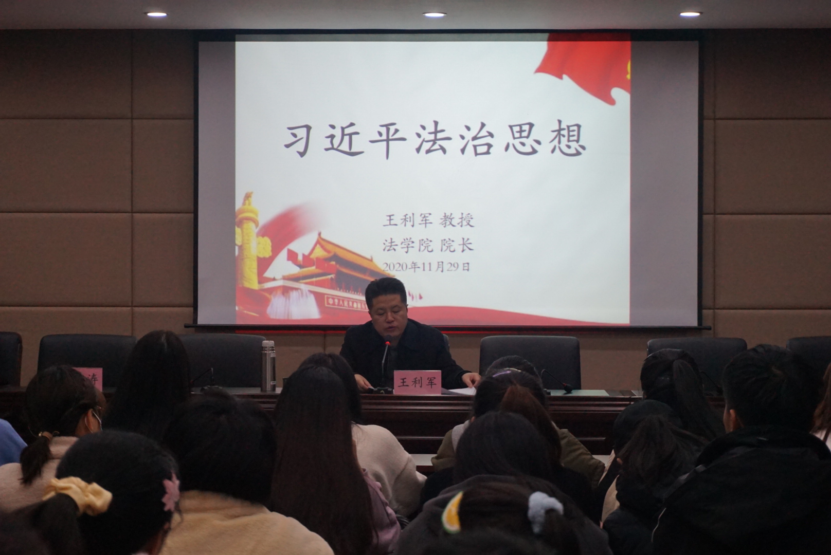121日晚,太阳成集团tyc122ccvip经理王利军在模拟法庭三楼报告厅为各年级员工干部讲授习近平法治思想为主题的思政课活动由太阳成集团tyc122ccvip团委书记陈运涛主持。