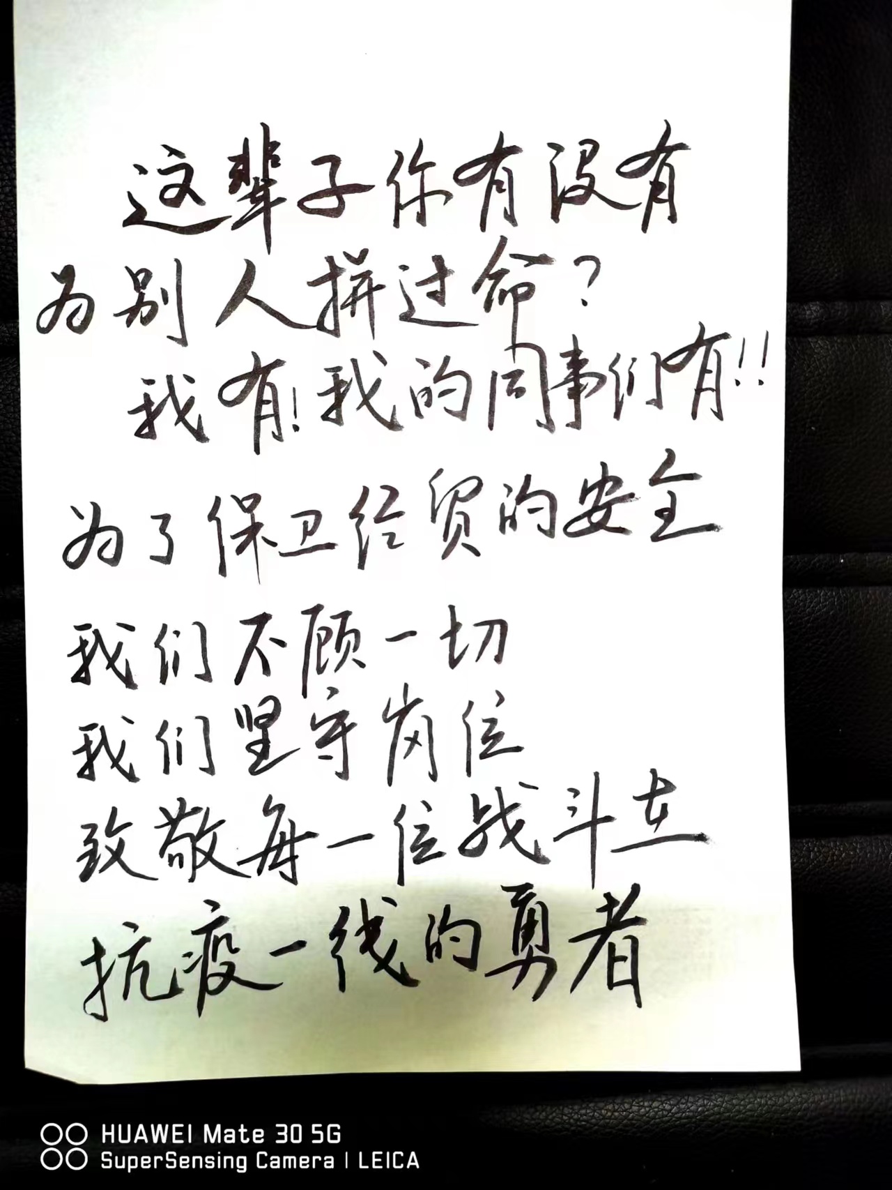万众一心者胜,上下同心者赢,没有翻不过的山,没有越不过的坎。太阳成集团tyc122ccvip全体教职工们责任在肩,使命在前,他们义无反顾,逆行而上,只为尽快阻止疫情蔓延,最大限度保障员工安全。在这场突如其来的灾难面前,我们每一个人都不能袖手旁观,我们相信,一份份微小的光汇聚起来必会凝聚成强大的合力,只要我们英勇奋斗,众志成城,一定能够打赢这场疫情防控阻击战!
