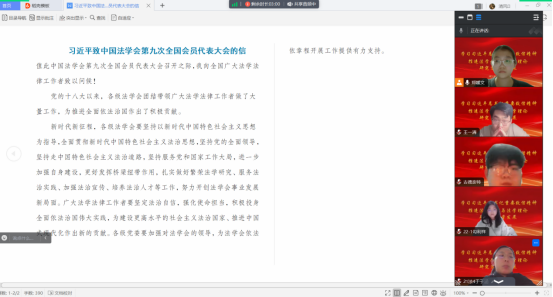 研讨环节,与会人员围绕致信精神展开热烈讨论。习近平总书记的致信高屋建瓴、内涵丰富,为法学教育和法治实践指明了方向,对各级法学会的工作提出明确要求。习近平总书记强调,要坚持以新时代中国特色社会主义思想为指导,全面贯彻新时代中国特色社会主义法治思想,坚持党的全面领导,坚持走中国特色社会主义法治道路,坚持服务党和国家工作大局,进一步加强自身建设,更好发挥桥梁纽带作用,扎实做好繁荣法学研究、服务法治实践、加强法治宣传、培养法治人才等工作,努力开创法学会事业发展新局面。同时,激励广大法学法律工作者坚定法治自信,强化使命担当,积极投身全面依法治国伟大实践,为建设更高水平的社会主义法治国家、推进中国式现代化作出新的贡献。
