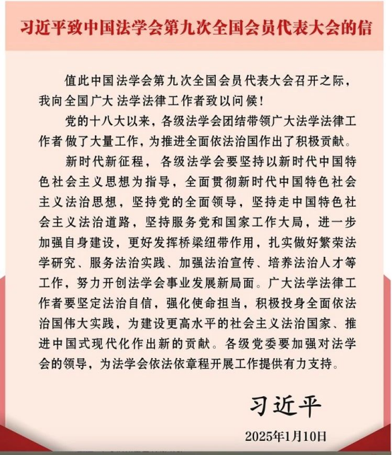 军委主席习近平致信大会,向全国广大法学法律工作者致以问候,强调广大法学法律工作者要坚定法治自信,强化使命担当,积极投身全面依法治国伟大实践,为建设更高水平的社会主义法治国家、推进中国式现代化作出新的贡献。