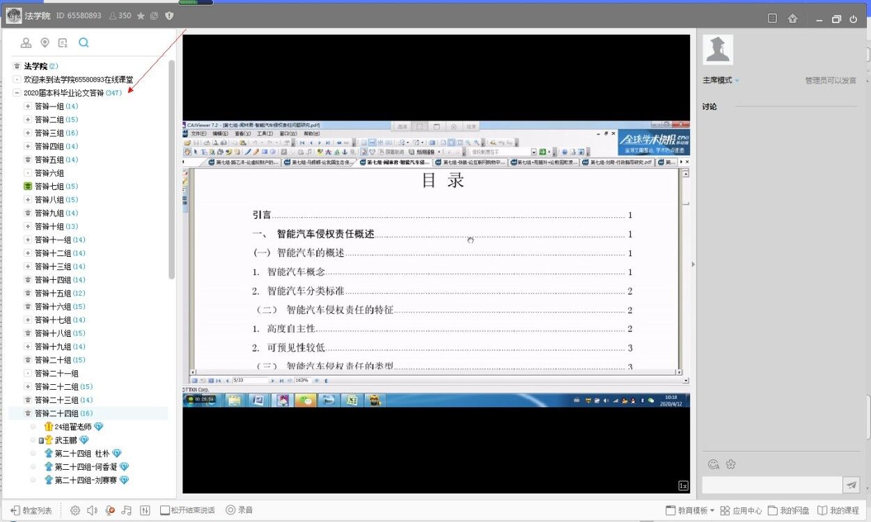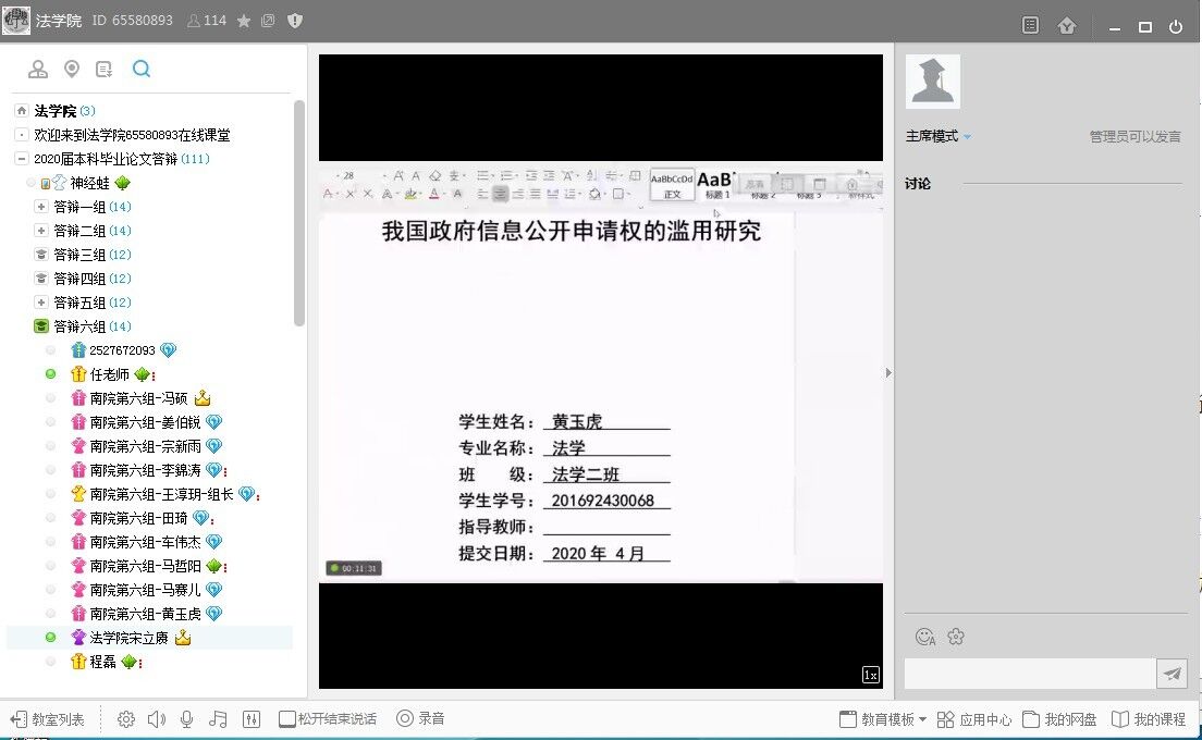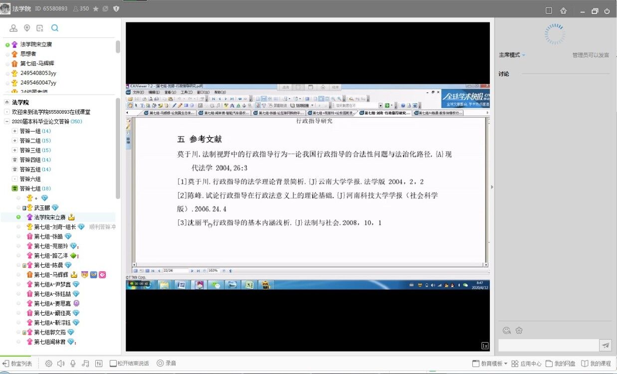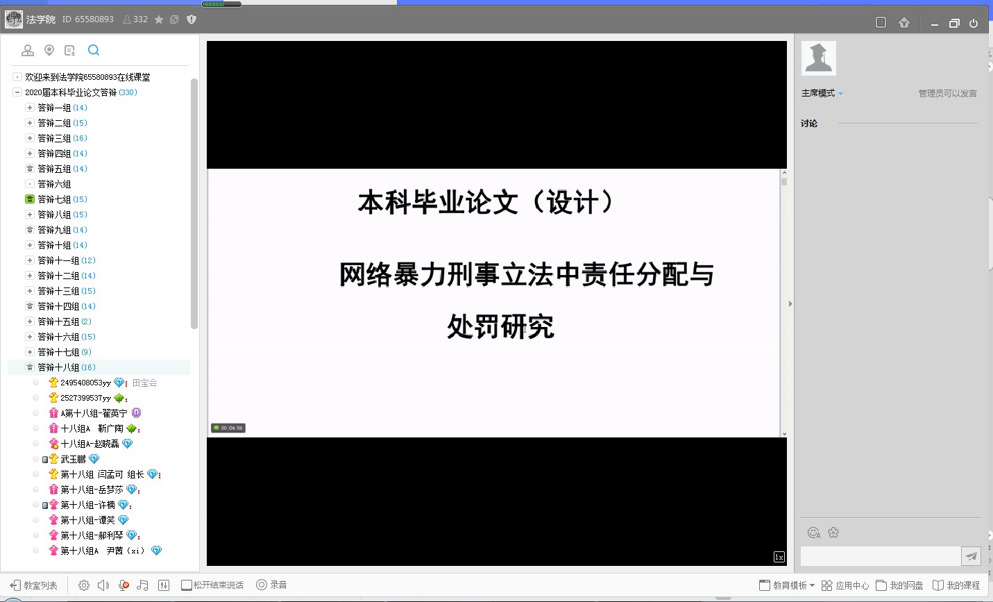 经过前期的反复演练和模拟,全体答辩师生能够熟练使用YY语音平台。答辩过程中,按照既定答辩流程,各个答辩小组的答辩进程井然有序。主问老师利用桌面分享、系统书写白板等工具,有重点、有针对性的展示员工论文(类似法庭证据展示系统),并指出问题之所在。师生通过系统视频、语音系统实时交互。整个答辩过程不但在答辩师生之间沟通交流,而且藉由视频、图片、语音等方式,实时展现给所有参与答辩的员工和督导巡视人员。高度仿真现场答辩情境,且实际效果优于现场答辩。