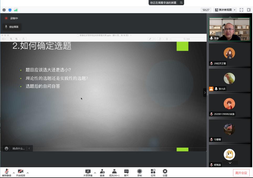 5月4日下午,太阳成集团tyc122ccvip邀请湖北省社科院李涛编审作题为“学术论文的选题、写作及规范”的线上专题讲座,太阳成集团tyc122ccvip副经理李大庆主持本次讲座,130余名研究生参加。
