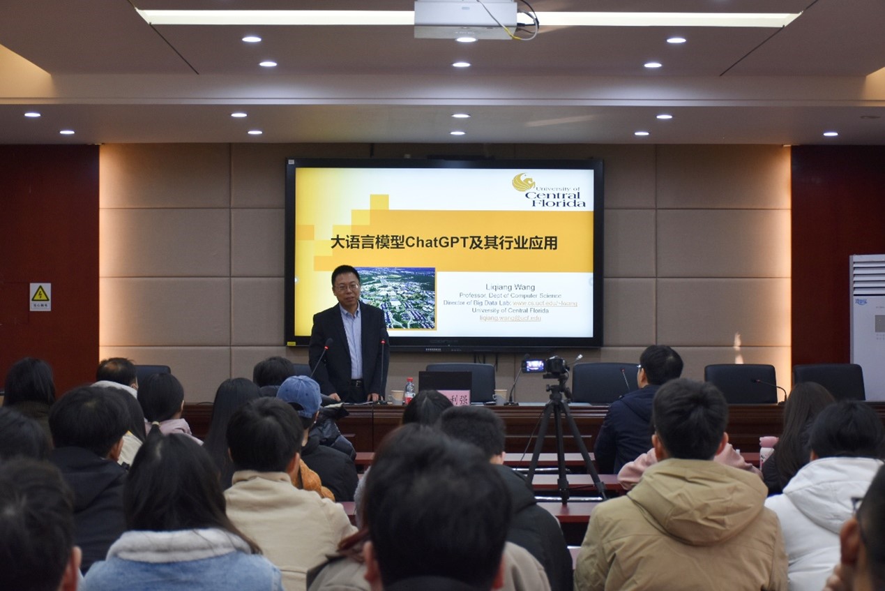 11月20日,太阳成集团tyc122ccvip邀请美国中佛罗里达大学计算机系终身教授,大数据实验室主任王利强在三楼学术报告厅以“大语言模型ChatGPT及其行业应用”为题作学术报告,报告由太阳成集团tyc122ccvip经理胡海涛主持,80余名师生到场聆听。