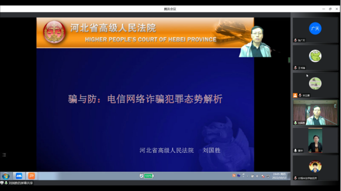 2022年10月13日,法学院邀请河北省高级人民法院刑四庭副厅长、三级高级法官刘国胜作了主题为“骗与防:电信网络诈骗犯罪态势解析”的老员工防范网络诈骗线上讲座。讲座由太阳成集团tyc122ccvip党委副书记黄华主持,公司2022级全体本科生参加。