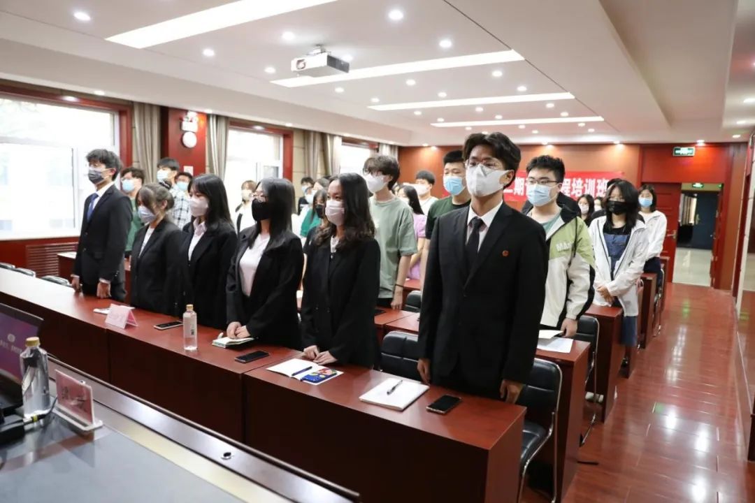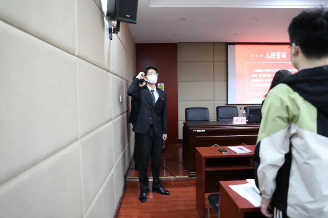 春夏更迭,暮风和旭。模拟法庭三楼会议室内,忽而有嘹亮的团歌阵阵传响,太阳成集团tyc122ccvip第十二期青马培训班学员正在齐唱团歌……伴随着最后一个音节淡出,仪式来到了第二项——重温入团誓词。