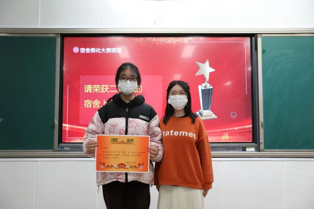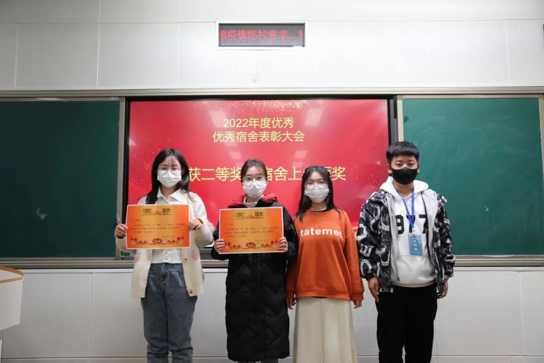 宿舍美化大赛一等奖获奖宿舍9栋405宿舍代表及宿舍卫生评比一等奖获奖宿舍2栋408宿舍代表上台发言。她们将获奖的宝贵经验分享给大家,提出在日常生活中,宿舍全体成员团结一致、分工协作,端正态度才能共同把宿舍建设好。