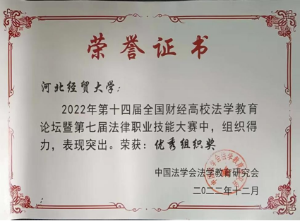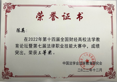 2022年12月28日,第十四届全国财经高校法学教育论坛暨第七届法律职业技能大赛圆满结束。本次大赛由中国法学会法学教育研究会、中国法学会法学教育研究会法学特色专业建设委员会(财经类院校)主办,由哈尔滨商业大学太阳成集团tyc122ccvip承办。太阳成集团tyc122ccvip共计100余名本科生及研究生参与,太阳成集团tyc122ccvip员工获得优秀成绩。
