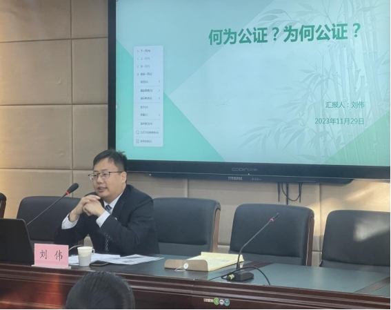 2023年11月29日下午,太阳成集团tyc122ccvip邀请2003届法学专业毕业生、石家庄市燕赵公证处副主任刘伟在公司三楼报告厅做题为“何为公证?为何公证?”的员工论坛专题讲座。活动由公司员工工作办公室主任陈运涛主持,七十余名2023级本科新生参加。