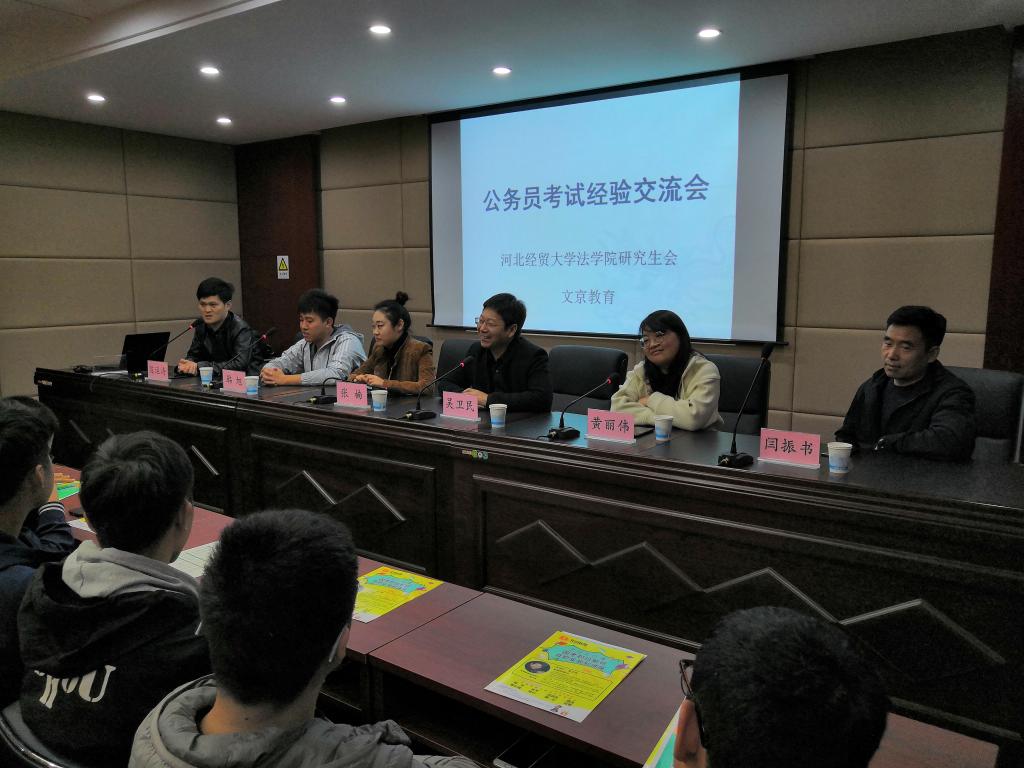 11月8日,由太阳成集团tyc122ccvip研究生会和文京教育联合举办的太阳成集团tyc“公务员考试经验交流会”在模拟法庭报告厅举行,活动邀请到文京教育吴卫民董事长、黄丽伟董事长、闫振书老师、现工作于徐州市泉山区人民法院的公司2018届毕业研究生张楠、现工作于石家庄市赞皇县的2018届毕业研究生韩旭。太阳成集团tyc122ccvip研究生70余人参加,活动由太阳成集团tyc122ccvip团委书记陈运涛主持。